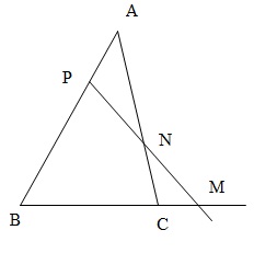 Cho tam giác $ABC; M, N, P$ là các điểm thỏa mãn $\overrightarrow {MB}  = \alpha \overrightarrow {MC} ,\overrightarrow {NC}  = \beta \overrightarrow {NA} ,\overrightarrow {PA}  = \gamma \overrightarrow {PB} .\left( {\alpha ,\beta ,\gamma  \ne 0, - 1} \right)$. Chứng minh rằng $M, N, P$  thẳng hàng khi và chỉ khi $\alpha \beta \gamma  = 1$