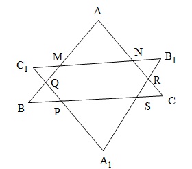 Cho hai tam giác $ABC,{A_1}{B_1}{C_1}$. Đoạn ${B_1}{C_1}$cắt các đoạn $AB, AC$ tại $M, N$. Đoạn ${C_1}{A_1}$ cắt các đoạn BC, BA tại P, Q. Đoạn ${A_1}{B_1}$cắt các đoạn $CA, CB$ tại $R$ và $S$. Chứng minh rằng: $\frac{{BC}}{{PS}} = \frac{{CA}}{{RN}} = \frac{{AB}}{{MQ}} \Leftrightarrow \frac{{{B_1}{C_1}}}{{NM}} = \frac{{{C_1}{A_1}}}{{QP}} = \frac{{{A_1}{B_1}}}{{SR}}$