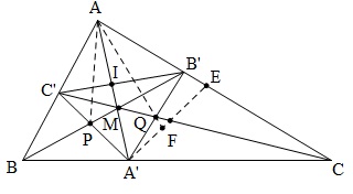 Cho tam giác $ABC, M$ là điểm trong tam giác. $AM,BM,CM$ theo thứ tự cắt $BC,CA,AB$ tại $A',B',C'$$MB,MC$ theo thứ tự cắt $A'C',A'B'$ tại $P,Q$. Chứng minh rằng $\widehat {BAM} = \widehat {CAM}$ khi và chỉ khi $\widehat {PAM} = \widehat {QAM}$’
