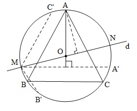 Cách 1 : Giả sử $\Delta ABC$ đều, nội tiếp đường tròn $\left( {O;R} \right)$, đường thẳng $d $ qua $O$ cắt đường tròn tại $M$ và $N$. Gọi các điểm đối xứng của $M$ qua $OA, OB, OC$ lần lượt là $A’, B’, C’$.