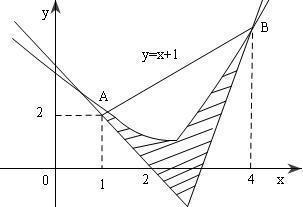 Tính diện tích của hình phẳng giới hạn bởi Parabol ($P$) có phương trình $y = x^2- 4x + 5$ và hai tiếp tuyến của ($P$) kẻ tại hai điểm $A(1 ;2)$ và $B(4 ;5)$